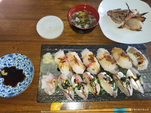 カンルアン(ホソヒラアジ)の握りとウメイロの炙りとウメイロの握り。