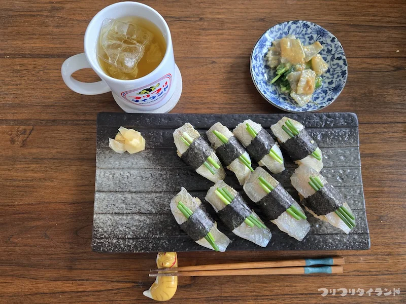 昼食はキスの身とやっこねぎのヌタと美味しく無いと分かってても作ってしまう握り寿司のやっこねぎ乗せ。