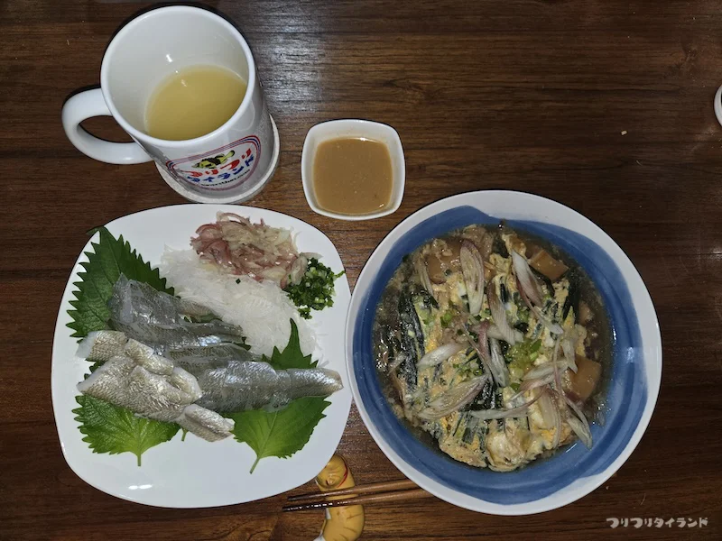 右のは、日本産ニラの卵とじ……。キスのお刺身よりコレの方が絶対旨し!!